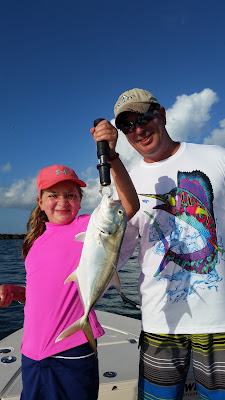 Matt and his 8 year old daughter Diana had fished with me back in the spring and Diana was hilarious then with her famous statement "can we go real fishing now" after Matt lost a big 100 plus pound tarpon after a 45 minute fight. Today we would go "real fishing" first and then go look for bonefish. It started slower than I would have liked but Diana caught some fish including a spunky jack that gave her all she could handle. Turning our attention to the flats we ended up taking a number of shots at permit and a school of bonefish.